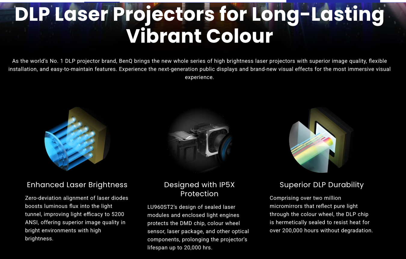 An exclusive Simulator Mode simplifies setup with pre-calibrated image settings, while Fast Mode delivers low-latency performance to support responsive, real-time simulator interaction. The LU960ST2 is engineered to meet the demands of high-use simulator environments where image quality, durability, and installation flexibility are essential.